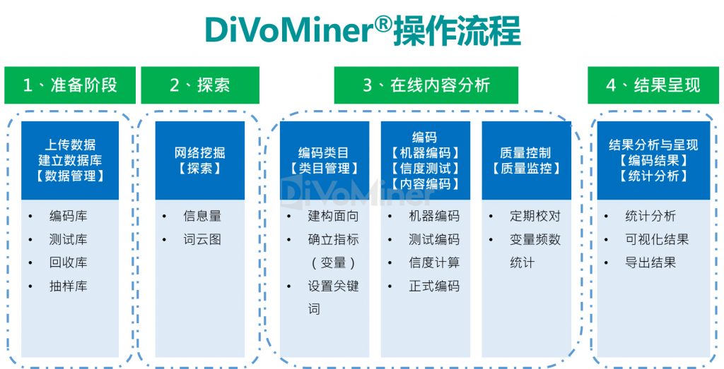 DivoMiner®文本大数据挖掘及分析平台,经过准备阶段、探索、在线内容分析( 编码及质量控制 )和结果呈现四个主要流程: