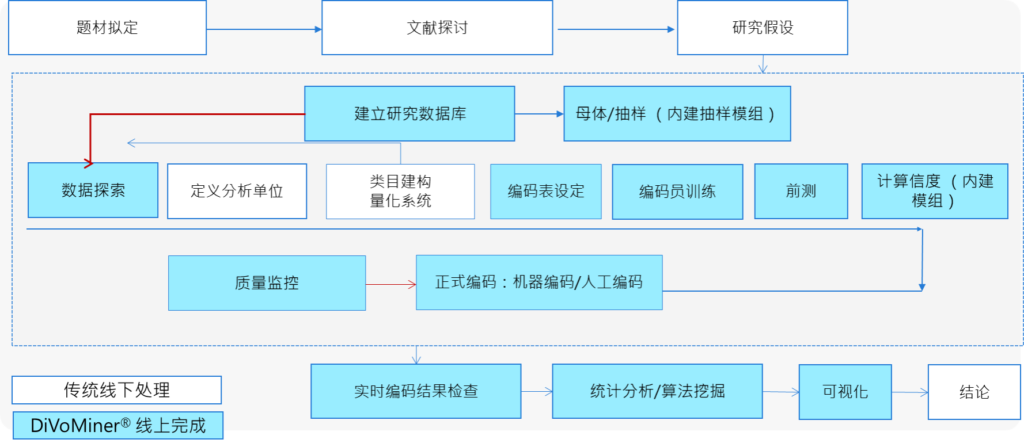 DiVoMiner® 大数据技术辅助内容分析整体思路及流程遵循传统内容分析法的原则,同时在操作程序上创新,部分步骤借助计算机和大数据技术完成,如下图中蓝色方框内的部分。