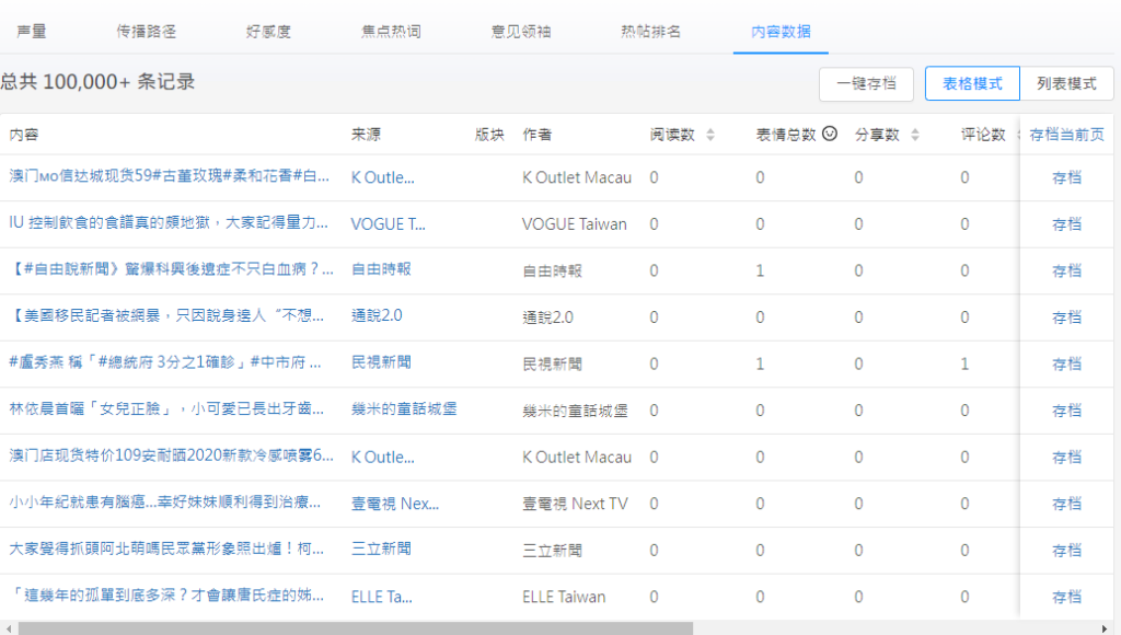 内容数据 在设定的查询条件下,实时监测到的网络数据,包括当前文本内容、来源、板块、阅读数、表情总数、评论数、点赞数、分享数、字数、热度值、发布时间等数据,内容中匹配到的关键字词会被标注颜色。 Doc navigation← 热帖排名条件查询 → 这篇文章对您有帮助吗? 是 否 我们能如何帮助您? 姓名 Email 主题 内容