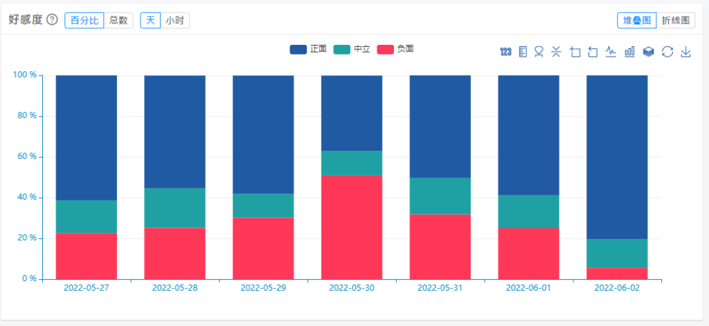 好感度 在设定的查询条件下,依据自动情感分析算法,将实时监测的文本内容的整体情感倾向(正面、中立、负面)的数量及趋势按天汇总统计,并予以展示。 【自动情感分析算法】是建立在主流算法的基础上,结合了机器学习算法、在线词库匹配模型及公司多年积累的内容分析实践经验,构建而成的算法模型。 【情感倾向】分为正面、中立、负面三种,图像可选择堆叠图或折线图。 Doc navigation← 传播路径焦点热词 → 这篇文章对您有帮助吗? 是 否 我们能如何帮助您? 姓名 Email 主题 内容