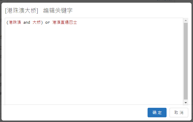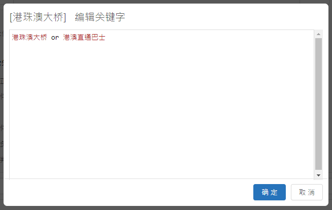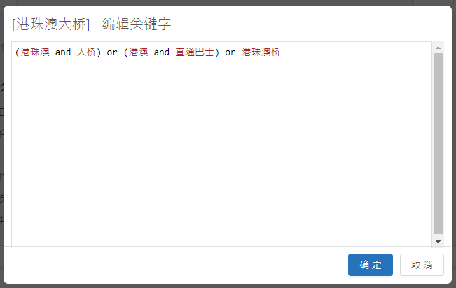 - 2. 上述搜索条件可进一步优化,比如,提及港珠澳大桥时可能未必是完整出现,若要针对这一情况,关键字可以修改设定为: