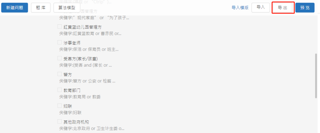 导出 用户也可点击【导出】, 将平台已设置的类目下载为本地文件,便于保存管理,之后也可导入其他话题中使用。 Doc navigation← 导入预览 → 这篇文章对您有帮助吗? 是 否 我们能如何帮助您? 姓名 Email 主题 内容