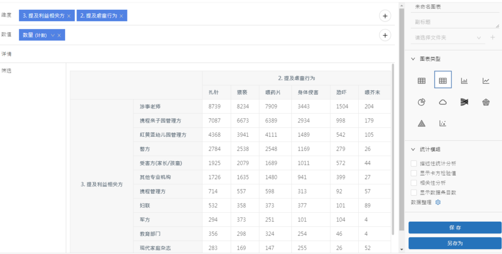 交叉表格 【交叉表格】(须多个维度及一个数值),它是一个可以同时展现两个或多个变量的联合分布及其结果的分析表格, 以某个单变量作为起点(“维度”中的第一个变量),再依起点变量细分为两个或多个细目。 如下图:可得知提及的利益相关方及提及虐童行为方式上的数量。 Doc navigation← 表格柱状图 → 这篇文章对您有帮助吗? 是 否 我们能如何帮助您? 姓名 Email 主题 内容