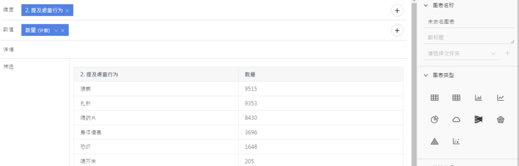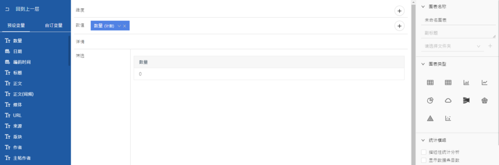 图表编辑区,由“维度”、“数值”、“筛选””构成。需要检视的内容放入“维度”中,与检视内容相关的数量字段则放入“数值”中,而“筛选”能够进一步缩小被放入的字段的范围,从而达到对数据筛选的目的。例如,需要知道各数据库的文本数量时,首先在“维度”中放入“数据库”,其次在“数值”中放入“数量”。