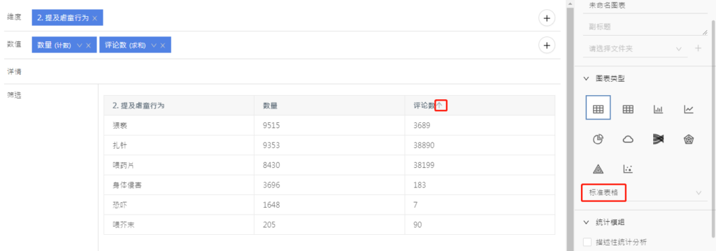 表格 【表格】(可多个维度多个数值),显示单/多个变量对应的单/多个数值。如下图,呈现各个数据库下提及虐童行为的数量。 【表格】有两种类型,分为【标准表格】和【排名表格】。 【标准表格】下,在“数值”中放入的字段,可以根据从大到小或从小到大排序。如图: 【排名表格】下,增加了“序号”列,序号仅根据“数值”中的第一个字段排序, 且序号从小到大分别对应第一字段数量的由多到少。 Doc navigation← 图表类型交叉表格 → 这篇文章对您有帮助吗? 是 否 我们能如何帮助您? 姓名 Email 主题 内容