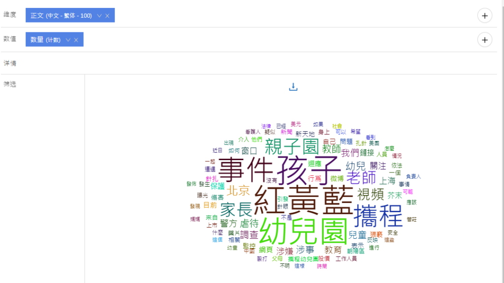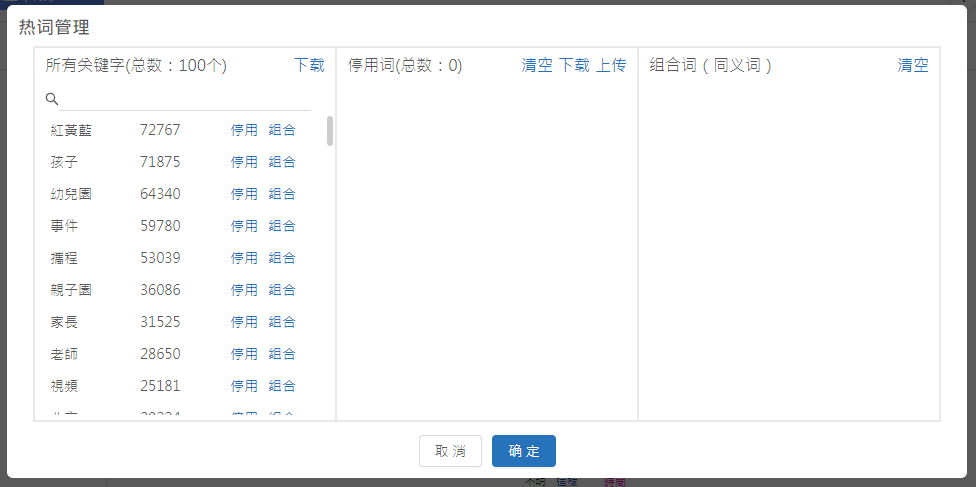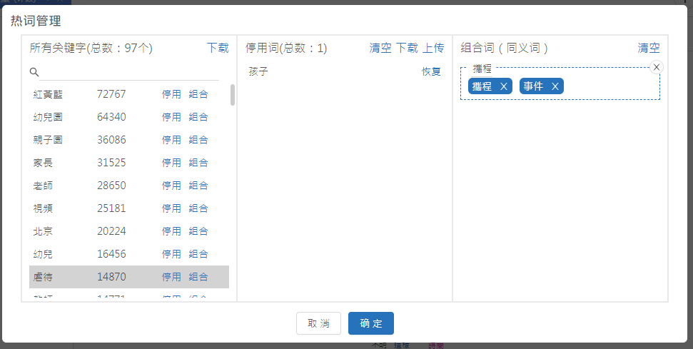 词云图 一种对文本内容中出现频率较高的“关键词”予以视觉上的突出,组成类似云的彩色图形,形成“关键词云层”或“关键词渲染”。 在“词云管理”中,可以实现对词云图中个别关键字的调整。包括停⽤词语及组合近义词。“停⽤” 即词云图中不展现该词,“组合” 即把2个或多个词组合成为⼀个词呈现。 ,如图: 点击【停用】,即可停用该词,该词即不会在词云图中显示。 当需要将两个词或多个词组合时,可点击【新建组合词】按钮,在下拉选项中选择需要组合的新词,组合之后的词语则会以组合词的形式出现在词云图中。 Doc navigation← 饼图雷达图 → 这篇文章对您有帮助吗? 是 1 否 1 我们能如何帮助您? 姓名 Email 主题 内容