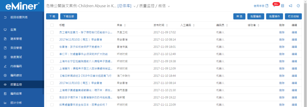 质量监控 在正式编码过程中,可通过平台监控编码结果,以随时校对保证编码质量。本版块可查看指定编码员、类目、编码时间等任一选项,具体分为【下载】、【筛选】、 【批量编码】、【批量操作】 和【栏目控制】。 在【质量监控】中可以修改编码结果,包括机器编码及人工编码结果,点击数据右侧的【编辑】,修改结果【保存】即可。 如何查看编码员的留言? 目录下载 筛选 栏目控制 批量删除 批量编码 Doc navigation← 编码绩效编码结果 → 这篇文章对您有帮助吗? 是 1 否 我们能如何帮助您? 姓名 Email 主题 内容