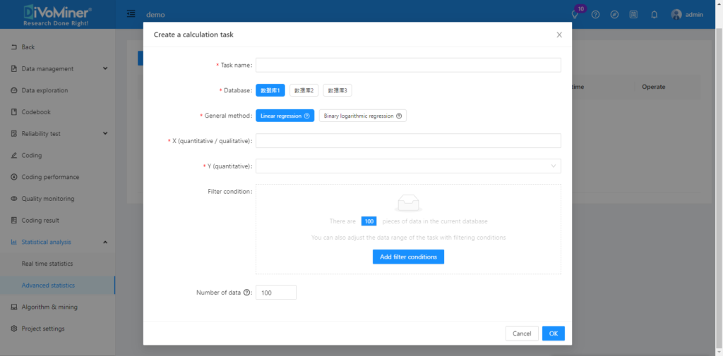 1. Create a new linear regression analysis task: Click “Statistical analysis”; enter the Advanced statistics page, and select Linear regression as the analysis method. Follow the instructions on the page to select or edit the content of the corresponding field.