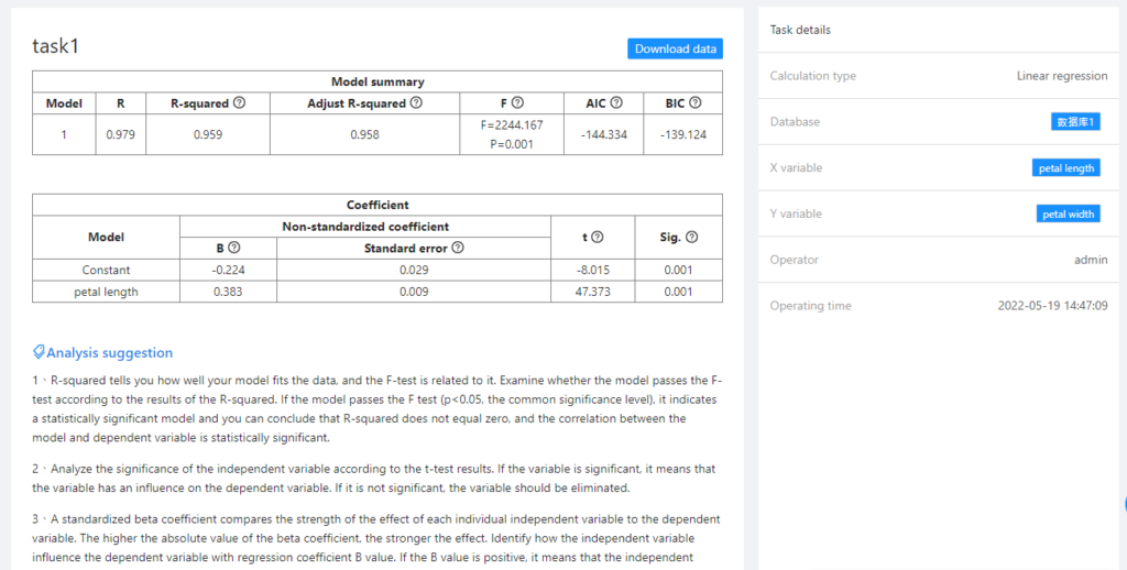 2. View the analysis results: Click “View data”; enter the analysis details page and view the regression analysis results.