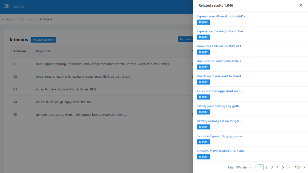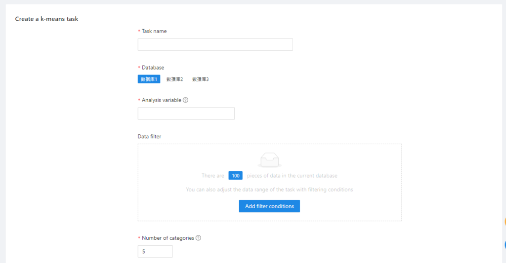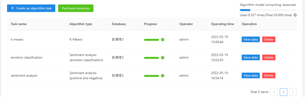 - 1. Create a new sentiment analysis: click “Statistical analysis”; enter the Mining algorithm page; click “Create an algorithm” task; select K-Means, and edit the content of the corresponding field according to the page instructions.