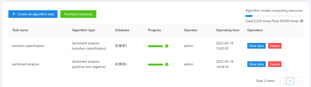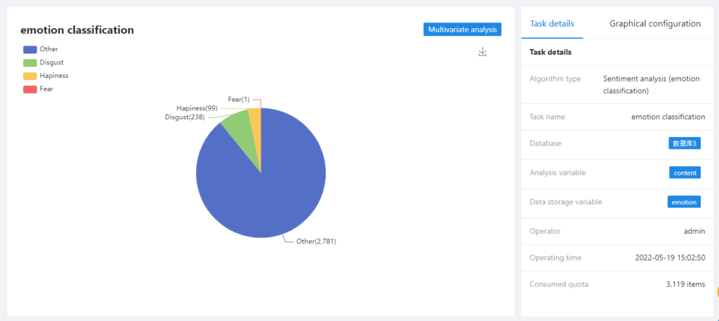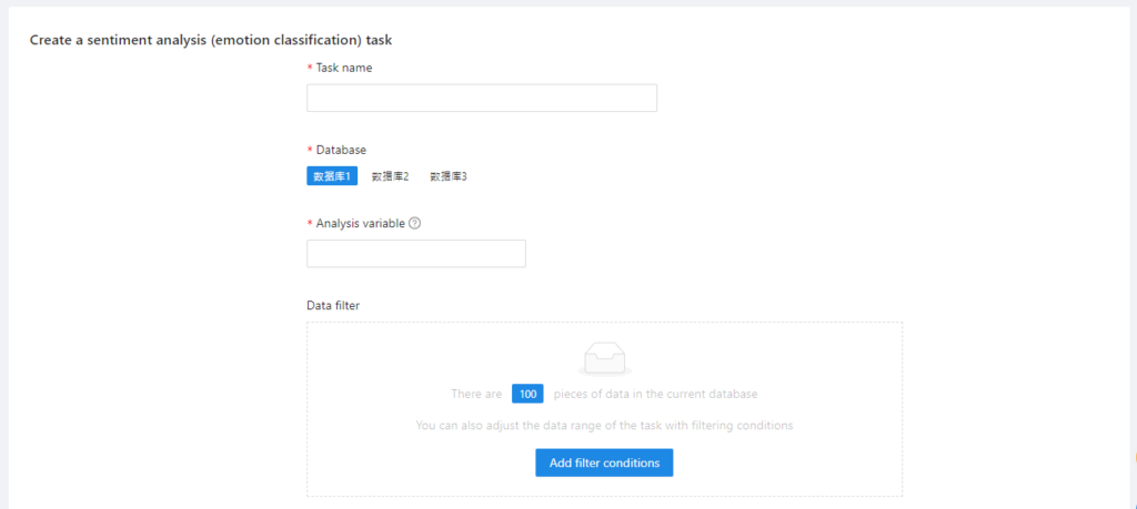 - 1. Create a new sentiment analysis (emotion classification): click “Statistical Analysis”; enter the Mining algorithm page; click “Create an algorithm” task; select sentiment analysis (emotion classification), and edit the content of the corresponding field according to the page instructions.
