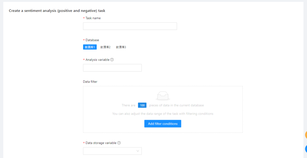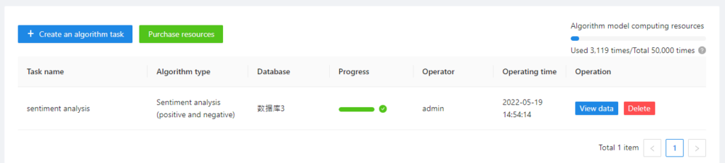 • 1. Create a new sentiment analysis: click “Statistical analysis”; enter the Mining algorithm page; click “Create an algorithm” task; select sentiment analysis (positive and negative), and edit the content of the corresponding field according to the page instructions.