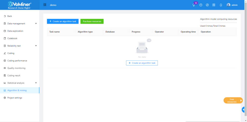 Note: If the algorithm quota is insufficient for the algorithm and model task, you need to purchase the algorithm quota before executing the algorithm task.
