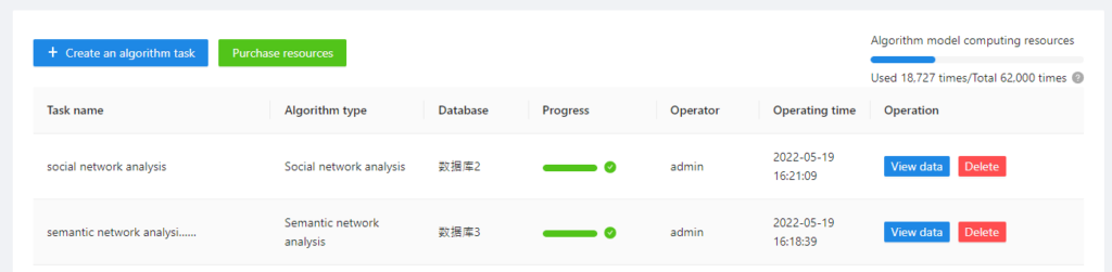 - 1. Create a new sentiment analysis: click “Statistical analysis”; enter the Mining algorithm page; click “Create an algorithm” task; select social network analysis, and edit the content of the corresponding field according to the page instructions.