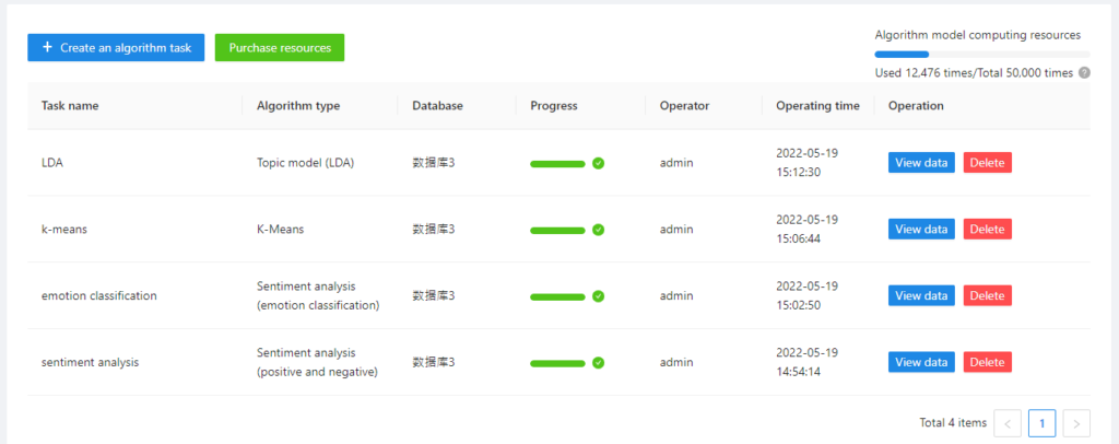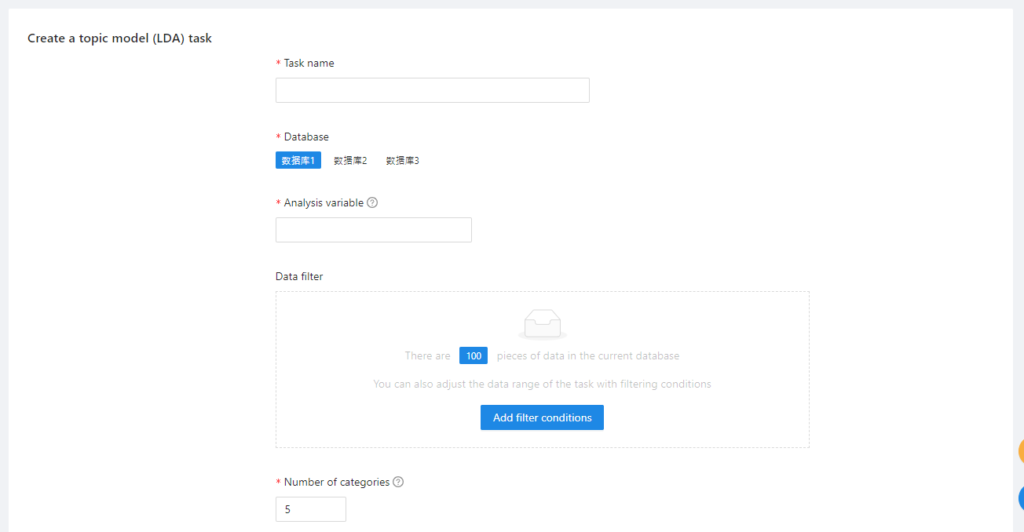 • 1. Create a new sentiment analysis: click “Statistical analysis”; enter the Mining algorithm page; click “Create an algorithm” task; select topic model(LDA), and edit the content of the corresponding field according to the page instructions.