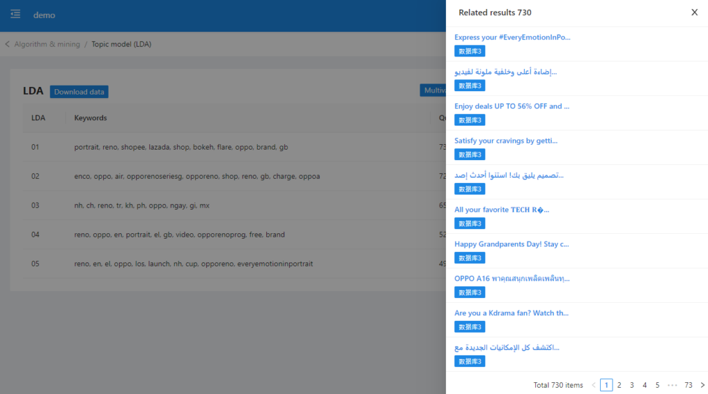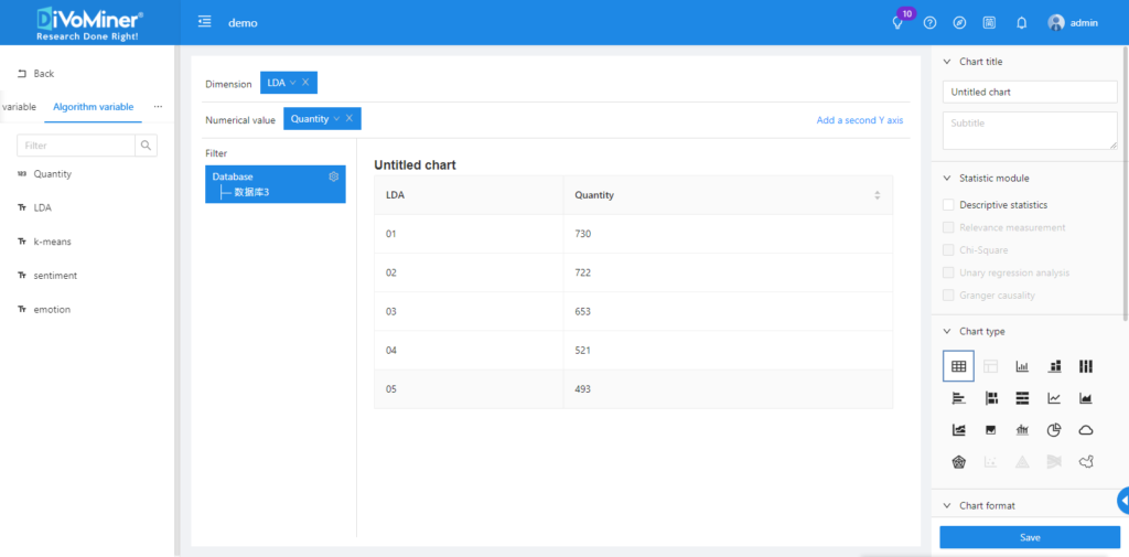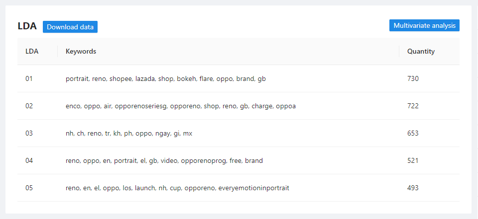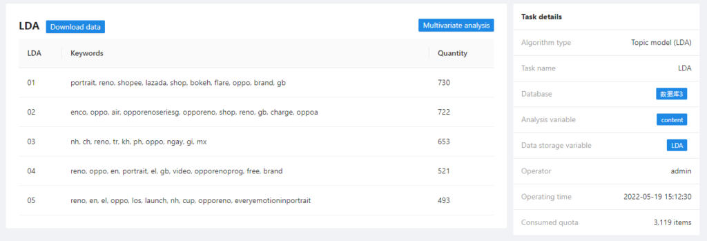 • 3. Multivariate Analysis: click “Multivariate analysis” to cross-analyze the algorithm results of topic model(LDA) with other variables.