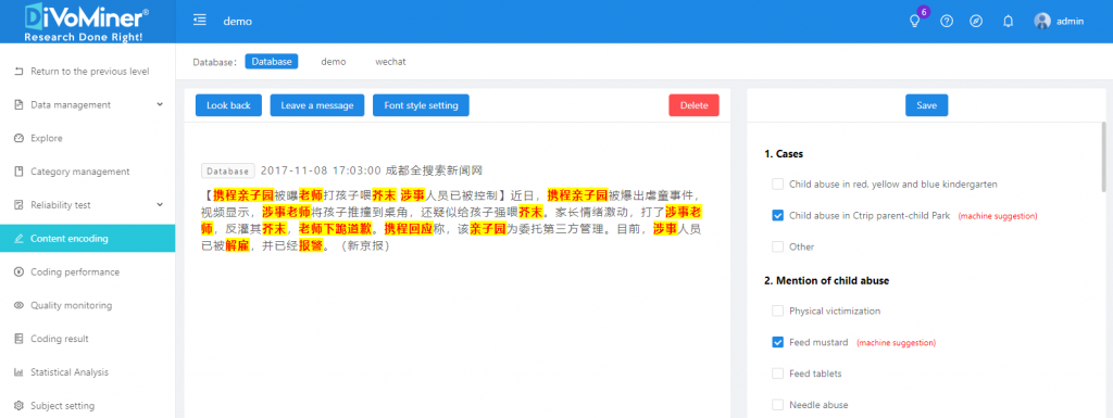 The Coding section is for formal coding in content analysis. The platform combines machine-coding advice with manual coding to improve coding efficiency and ensure coding quality. In the Reliability Test section, the layout of the Coding page is the same as the Precoding page. The left side is the text data shown with the customized coding setting, and the right side is the detailed coding category. The Coding section is further divided into “Review” and “Feedback”.
