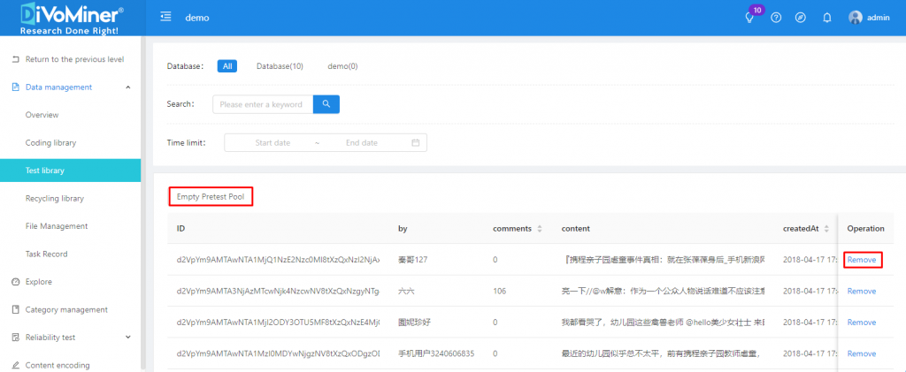 The data in the pretest pool is randomly sampled from the coding pool, and it is mainly used for inter-coder reliability test. In the Pretest Pool page, click [Empty Pretest Pool] to clear all the sample data in the pretest pool, or you can click [Remove] to delete the sample data one by one.