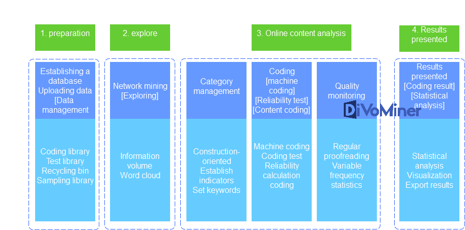 DivoMiner® big data text-mining and content analysis platform, uses big data technology to assist online content analysis. It consists of four major phases in operation: preparation, exploration, online content analysis (coding and quality control), and results presentation: