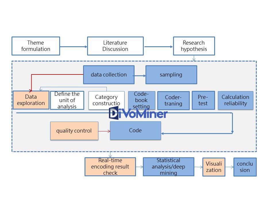 Online Content Analysis shares the same principles and operating procedures of the traditional content analysis. The difference is: certain steps of online content analysis assisted by the Internet and big data technology, as presented in the blue boxes below: