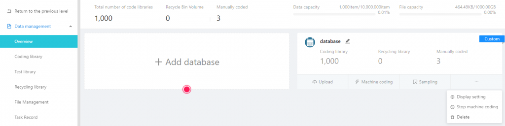 The Overview section shows the databases being created and the amount of data in each database. On this page, users can perform [Add Database], [Upload Data], [Machine Coding], [Sampling], [Display Settings], [Rerun Machine Coding], [Stop Machine Coding], and [Delete Database】.