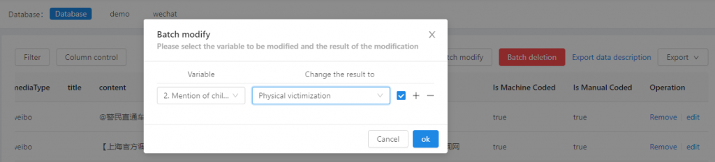 When the batch operation is confirmed, select the variable that needs to be modified and modify the results, and then click the tick symbol on the right side, to apply the modification. It is possible to modify the variable into multiple results at the same time, clicking “+” or “–” to add or remove a modified result.
