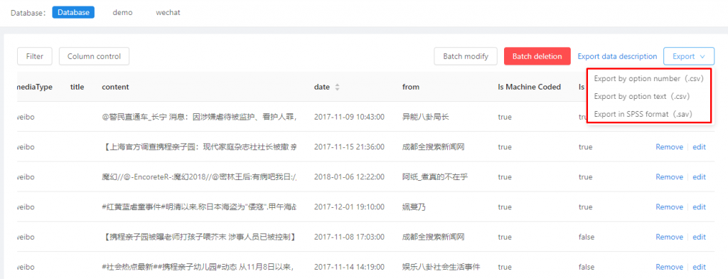 All coded data can be downloaded, and the downloaded files are in CSV and spss format. The CSV data can be downloaded according to the serial number or the text of the category options. According to your research needs, you can choose the format and the content of the data being downloaded.