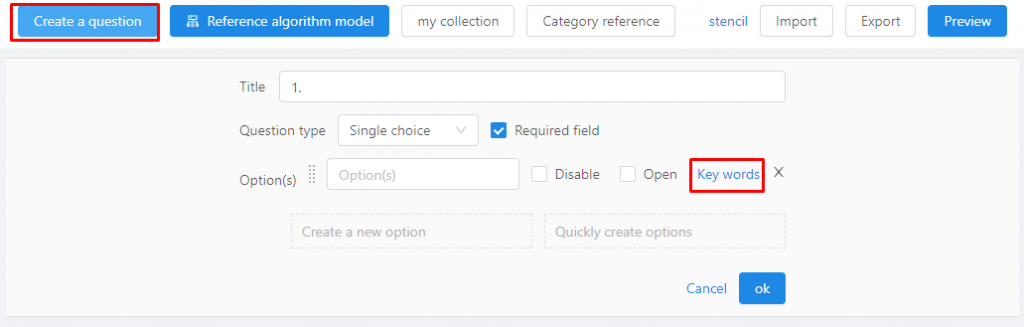 7. After the data import, click [Create a Question] on the Categorization page to start creating categories, and click [Keywords] on the right side of the category options to set keywords for the options.
