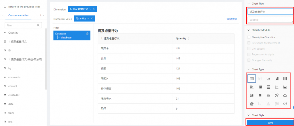 12. Drag the variables from the [Customized Variables] and [Default Variables] into the corresponding Dimensions, then select the Chart Type; name the chart, and finally Save the chart to complete the chart creation.
