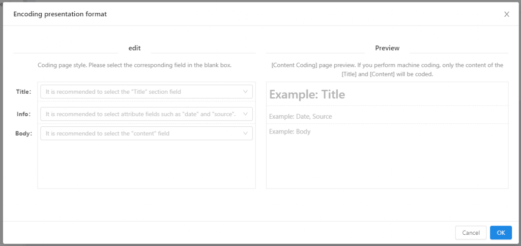 4. After the proofreading and revision of the data field type, start to set the configurations of the Coding page, that is, to select the data content field in the corresponding area.