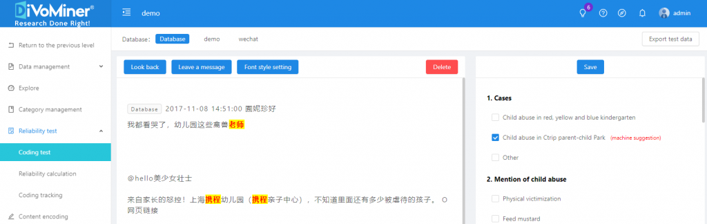 [Precoding]: A page where different coders independently code the data imported (randomly sampled) from the Coding Pool to the Pretest Pool. The content on the Precoding page is the same as on the formal Coding page, but the Precoding page is used for reliability test only. The left side of the Precoding page shows the textual data with the previously customized coding setting; the right side shows the detailed coding categories. Related keywords in the text will be auto-selected, and the words “Machine Advice” will be displayed beside the categorization options.
