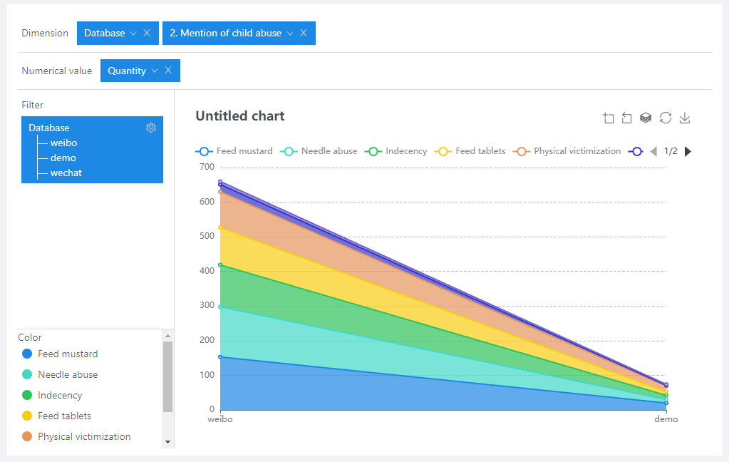 A stacked area graph is a special area graph that can be used to compare multiple variables in an interval. The difference between a stacked area graph and an area graph is that the starting point of each data series of the stacked area graph is drawn based on the previous data series. As such, the fully-stacked height of the topmost line will correspond to the total when summing across all groups. For example, the figure below shows the distribution of different child abuse behaviors in the mentioned incidents.
