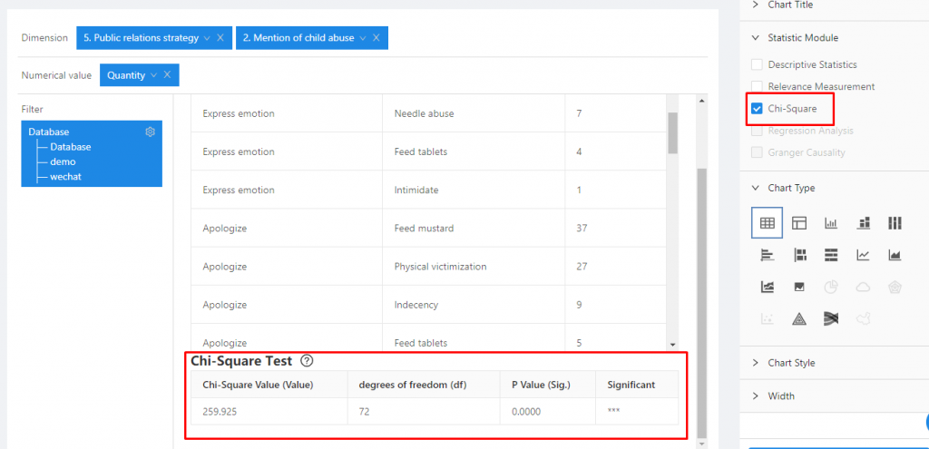 Drag two variables into the “Dimension” field, and then one variable into the “Value” field. Select the chi-square test value in the Statistical Module to check the associations between the two variables in the “Dimension” field.