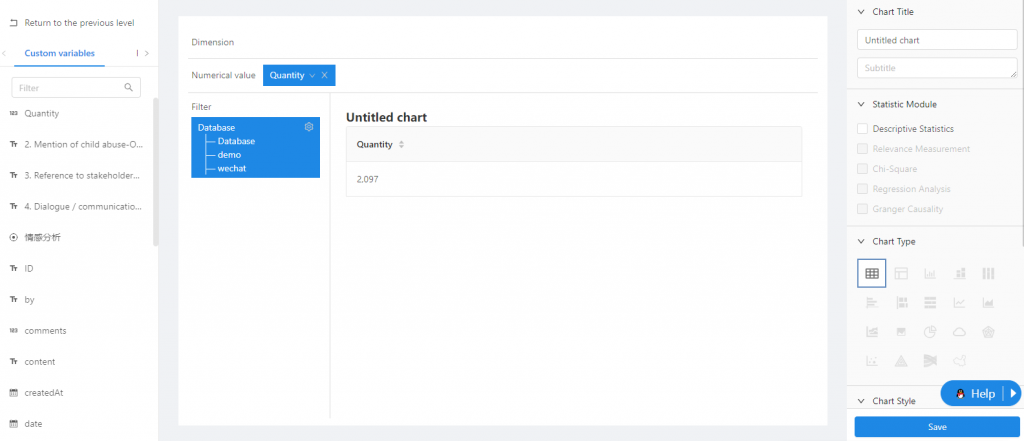 The “Chart Setting” is composed of chart function settings such as “Chart Name”, “Statistical Module”, “Chart Type” and “Chart Style”. After completing the chart naming and chart type settings, click “Save” or “Save as” button at the bottom of the page to save the chart settings.
