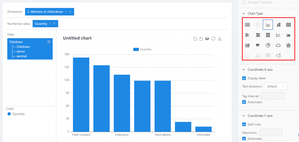 Chart editing area mainly consists of “Dimension”, “Value”, and “Filter”. The content that needs to be analyzed (e.g. coding categories) should be placed in the “Dimension” section, and the quantitative data (e.g. number of samples/counts) related to the content should be placed in the “Values” section, and the “Filter” can further narrow the scope of the data to be analyzed, for data screening purpose. For example, if you want to know the number of samples in different databases, first put “Database” in “Dimension”, and then put “Number (counts)” in “Value”.
