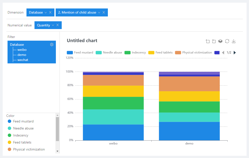 Another form of the stacked vertical bar chart, normally the stacking is based on the numerical value, and percentage stacking is based on the percentage of the numerical value. For example, the figure below shows the percentage of various child abuse behaviors in the mentioned incidents.