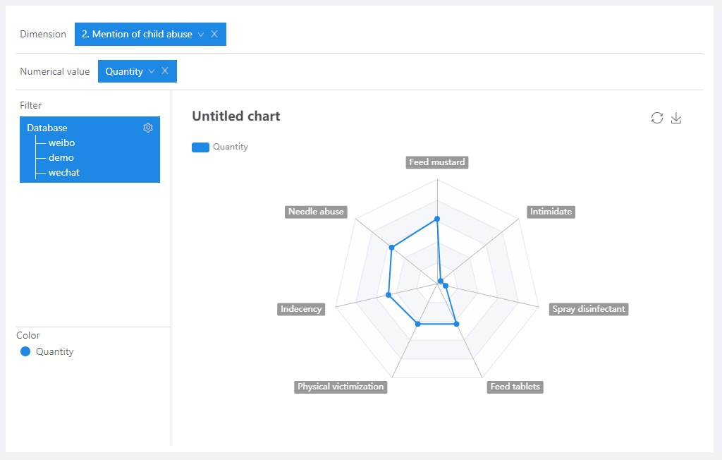Radar Chart, also known as Debra chart or Spider Chart, is a graphical method that is often used in financial analysis report. In a radar chart, the numbers or ratios obtained from the various financial analysis of a company are put on a circular chart, to show the financial situation of a company. Users can understand the changes and positive or negative trends of the company’s financial indicators at a glance. It is also commonly used to describe the overall situation of multiple indicators, or multiple indicators of one event with the time difference. Add variables with multiple indicators to the dimension field, and set corresponding numerical parameters, a circular radar chart can be obtained accordingly.