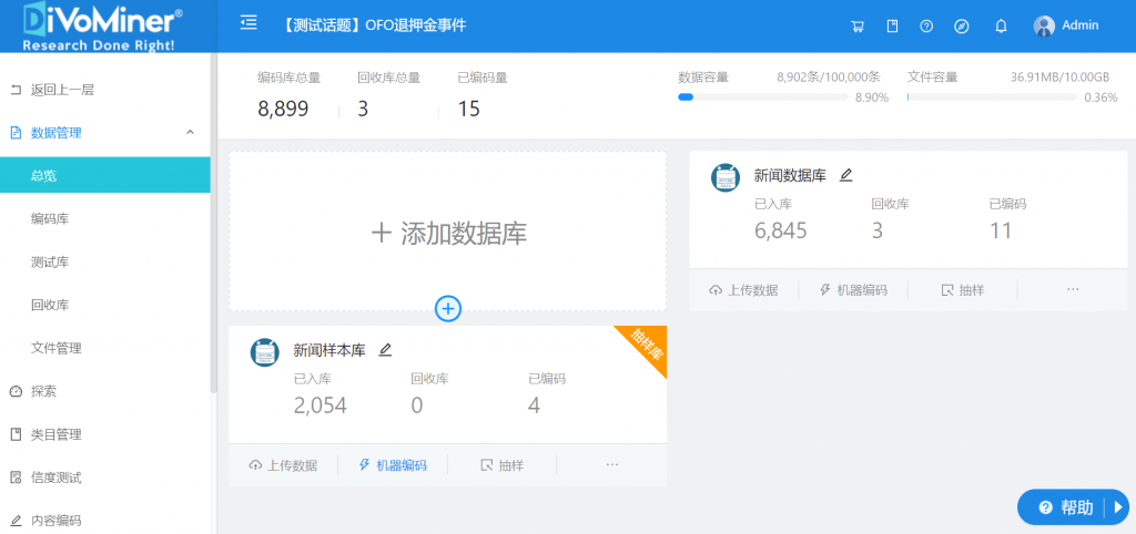 第三步:【数据管理】-【总览】,选择一个数据库,点击【机器编码】,等待执行完成。