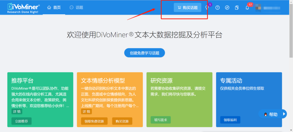 DiVoMiner® 上一个研究项目等于一个“话题”。平台上的话题分为免费话题和研究话题。两者在功能模块上完全一致,不同的只是数据量、类目数量和配套账号数量。 点这里查看免费话题和话题的差别