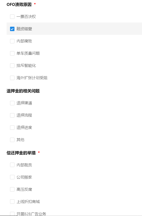 同时,可点击【预览】查看跳转题之间的逻辑是否设置成功。例如,选择“融资碰壁”的选项,随即显示“偿还押金的举措”题目。